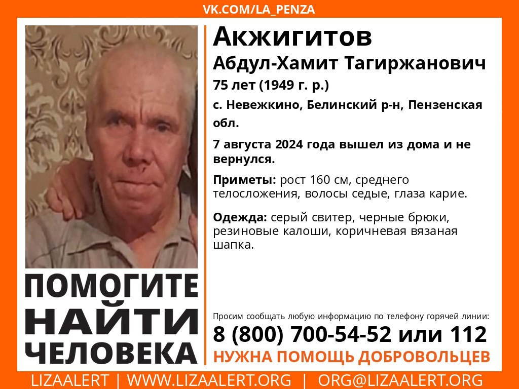7 августа Абдул-Хамит Тагиржанович Акжигитов вышел из дома и не вернулся.