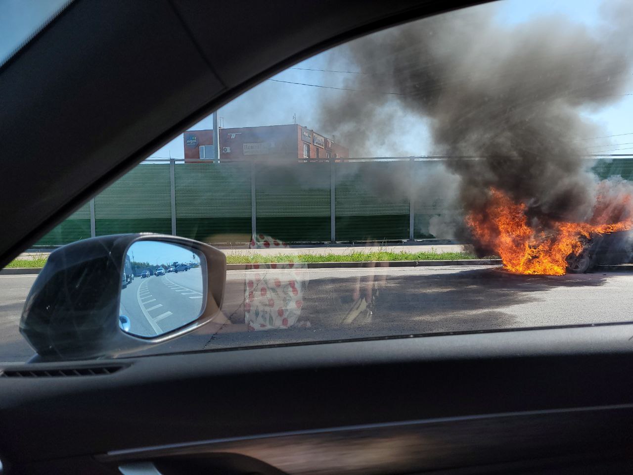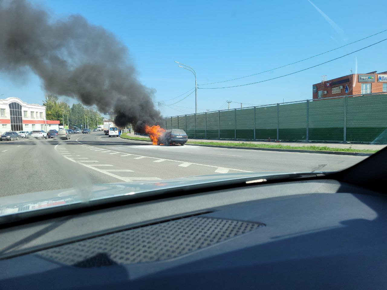 От загоревшейся машины - по словам очевидца, это автомобиль марки Volkswagen - поднимается стоб густого черного дыма.