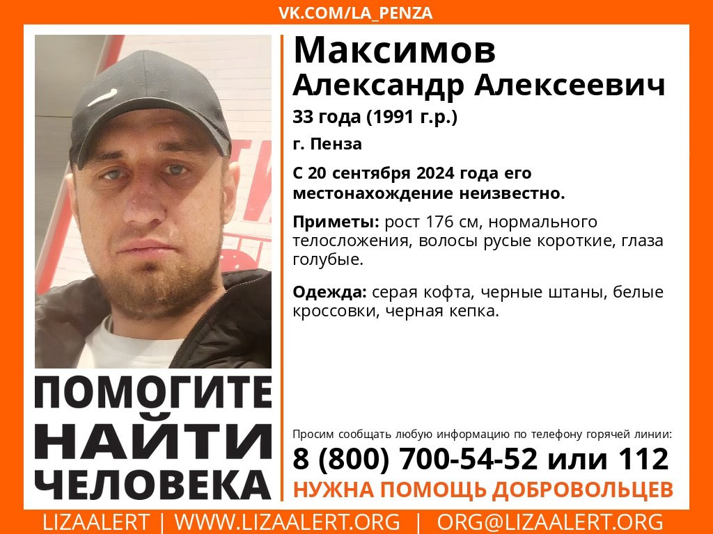Представители поискового отряда «ЛизаАлерт Пенза» проинформировали, что Максимов Александр Алексеевич 1991 года рождения (33 года), проживающий на территории города Пенза, пропал 20 сентября и уже 9 дней о местонахождении мужчины ничего неизвестно.