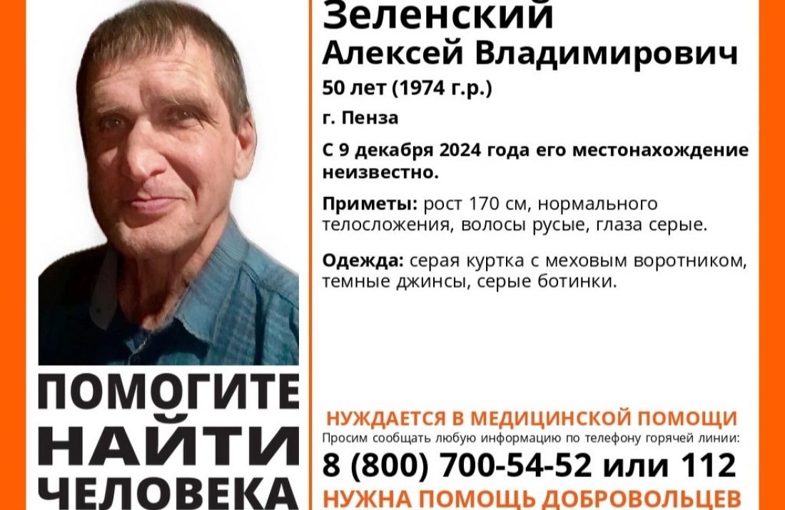 Его местонахождение неизвестно с 9 декабря. В день пропажи Алексей Зеленский был одет в серую куртку с меховым воротником и темные джинсы. На ногах у него были серые ботинки.