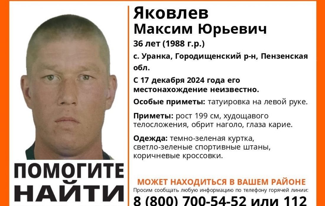 Местонахождение мужчины, проживающего в селе Уранка Городищенского района, неизвестно с 17 декабря. 36-летнего Максима Яковлева ищут близкие, полиция и добровольцы.