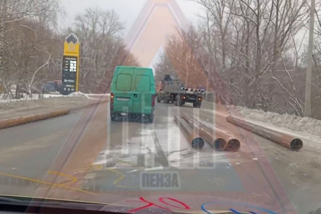 По словам автора поста, опубликованного в телеграм-канале «ДТП Пенза», из прицепа длинномера на дорогу начали вываливаться большие трубы.