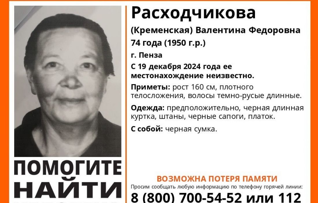 74-летнюю Валентину Расходчикову ищут близкие, полиция и добровольцы. В телеграм-канале «Лиза Алерт» Пензенской области сообщили приметы пропавшей: рост 160 см, плотного телосложения, волосы темно-русые длинные.