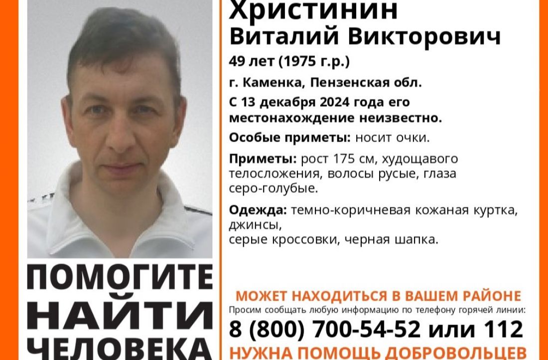 В ориентировке, распространенной отрядом «Лиза Алерт Пенза», указано, что Виталий Христинин худощавого телосложения, его рост - 175 сантиметров. У пропавшего русые волосы и серо-голубые глаза. В день исчезновения он был одет в темно-коричневую кожаную куртку и джинсы. На ногах у него были серые кроссовки, на голове черная шапка. Также волонтеры отмечают, что мужчина носит очки.