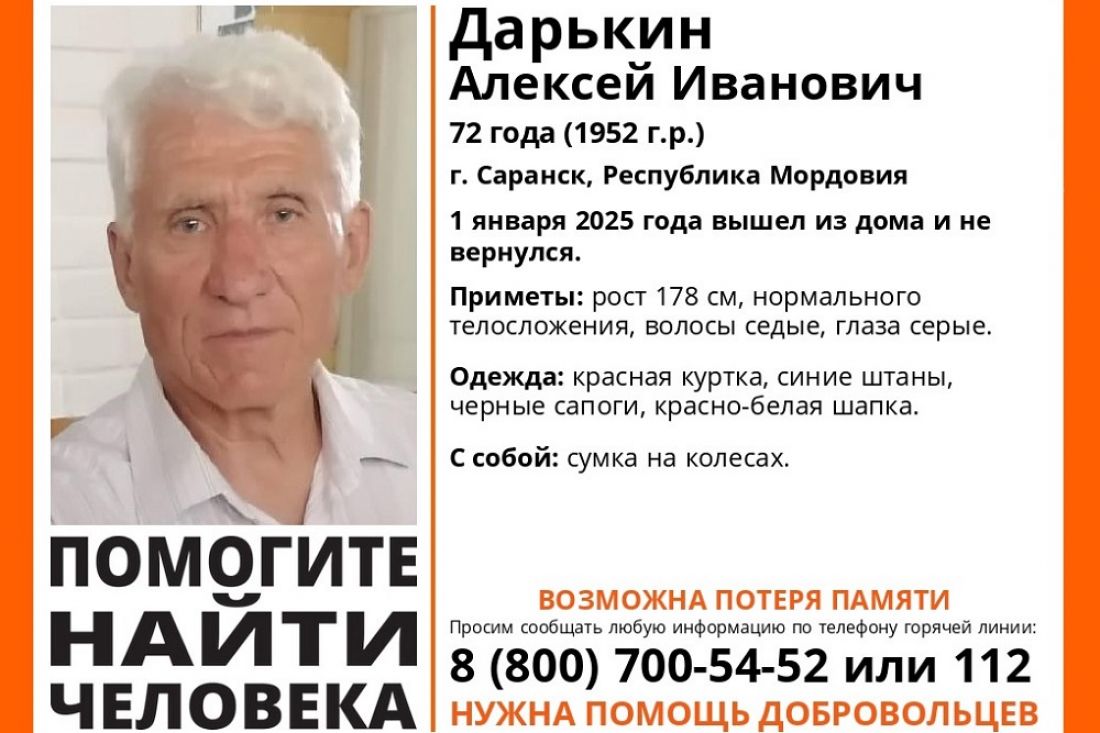 В ориентировке, которую распространил поисковый отряд «Лиза Алерт» Пензенской области, указано, что Алексей Дарькин нормального телосложения, его рост — 178 сантиметров. У мужчины седые волосы и серые глаза.