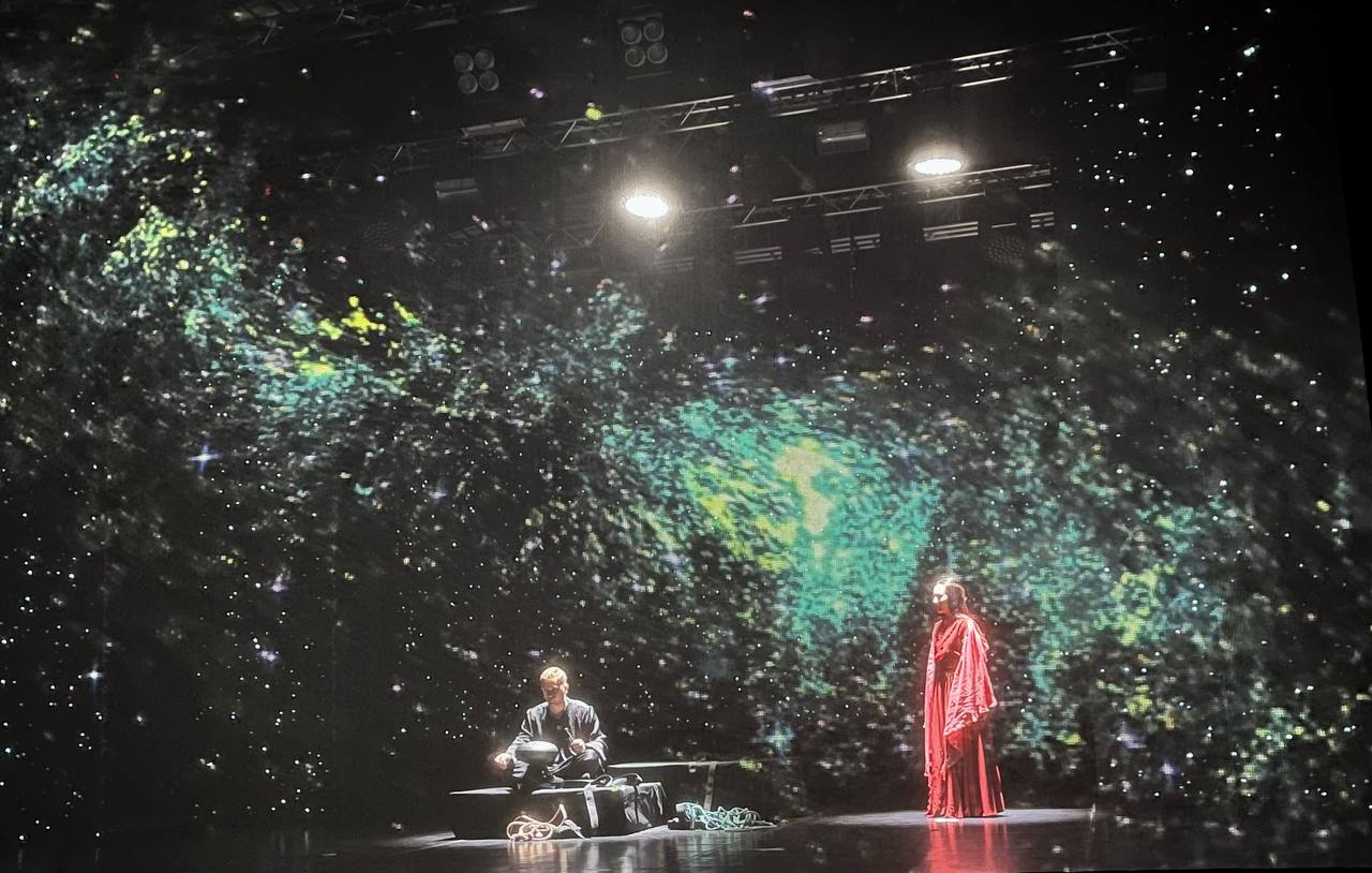 Первое, что видят зрители – перелистывание металлической книги. Видеопролог погружает их в историю далекой планеты с местными жителями-телепатами и воинами на металлических шершнях. В бесконечном потоке звезд видны силуэты виртуальных актеров, в точности повторяющие движения своих реальных прототипов. Пожалуй, один из самых эмоционально сильных моментов в спектакле — сон Иллы, в котором она впервые видит высокого землянина с голубыми глазами. Сцена начинается с рисунка главной героини, проекции продолжают каждый взмах её руки. Кажется, будто она создаёт изображения из воздуха, пылинок, танцующих в свете марсианского солнца. Но вот медитативное рисование погружает ее в сон, который разделит её жизнь на «до» и «после». Силу переживания раскрывает талантливая музыка композитора Андрея Шошкина.