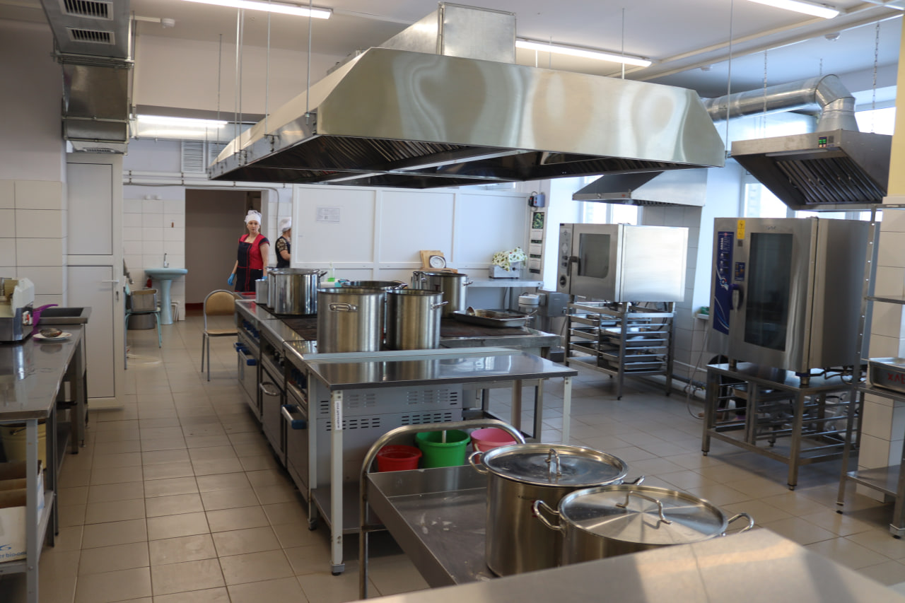 В учебном заведении создали современный пищеблок, закупив новое оборудование, посудомоечную машину, вытяжную зону, электрическую плиту и пароконвектомат.