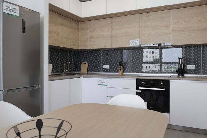 - кухонный гарнитур, со встроенной бытовой техникой брендового производителя – духовой шкаф, вытяжка, варочная панель.