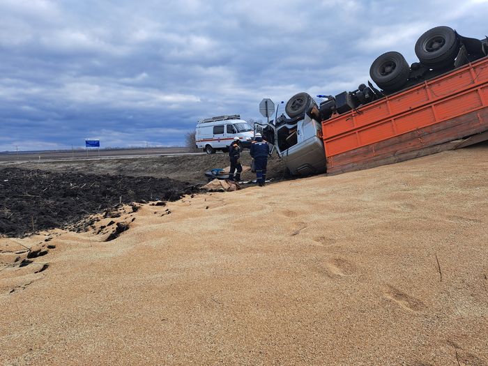 Водитель грузовика потерял управление, из-за чего машина съехала в кювет и перевернулась. В ее кабине оказался заблокирован травмированный водитель.