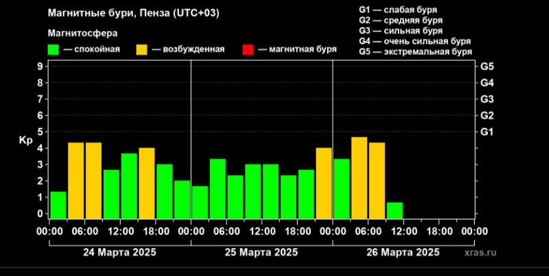 В данный момент на планете не зафиксировано геомагнитных бурь. При этом с 25 марта, начиная с 21 часа по московскому времени, геомагнитное поле иногда находится в состоянии слабого возмущения, а индекс Кр превышал отметку в 4 единицы. В настоящее время эти слабые возмущения все еще продолжаются, рассказал в своем телеграм-канале ведущий специалист центра погоды «Фобос» Михаил Леус.