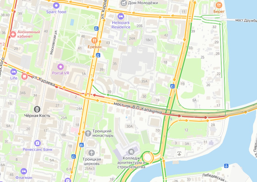 Согласно данным сервиса Яндекс.Карты, пробка также протянулась по улице Кураева.