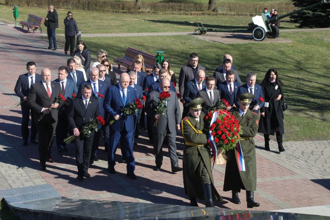 Участники памятной церемонии после исполнения государственных гимнов России и Беларуси почтили память павших минутой молчания.