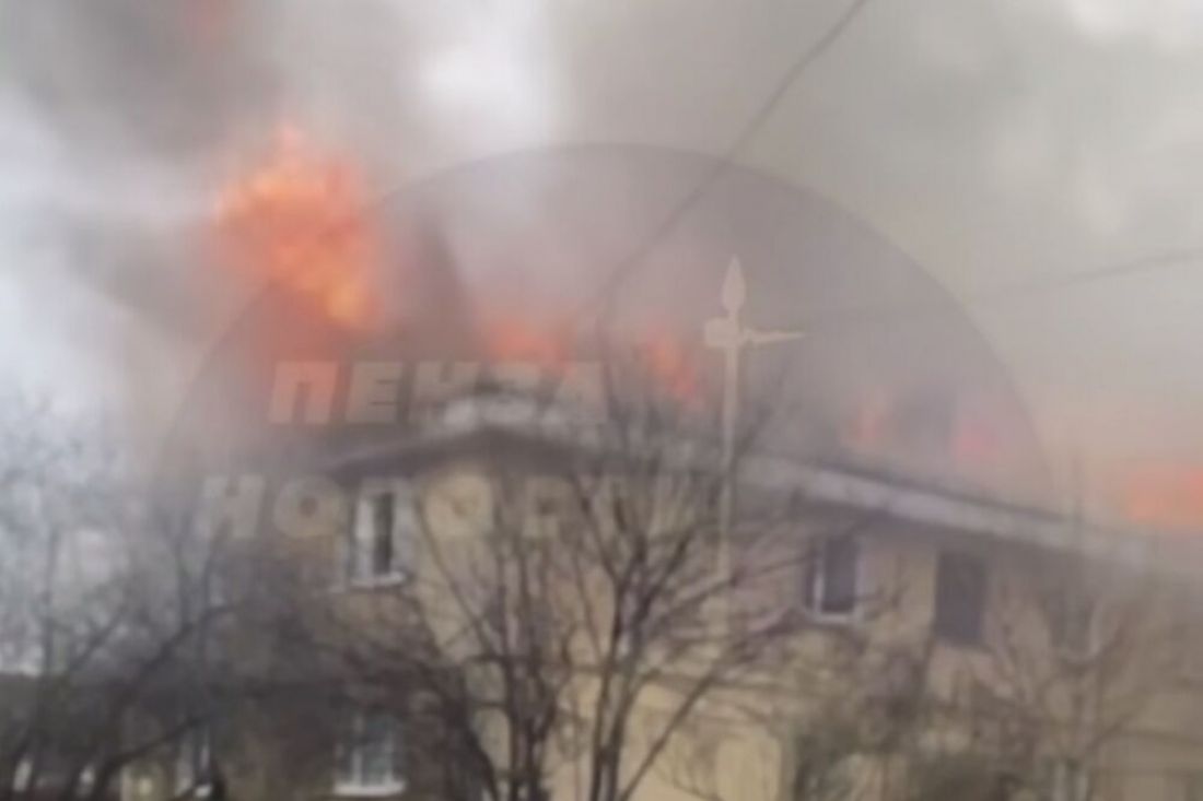 На кадрах видно, как языки пламени поднимаются вверх от крыши здания и валит густой черный дым.