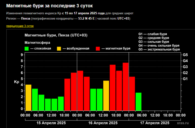 Минувшей ночью в Пензе магнитная буря почти достигла уровня G4, что соответствует очень сильной магнитной буре.