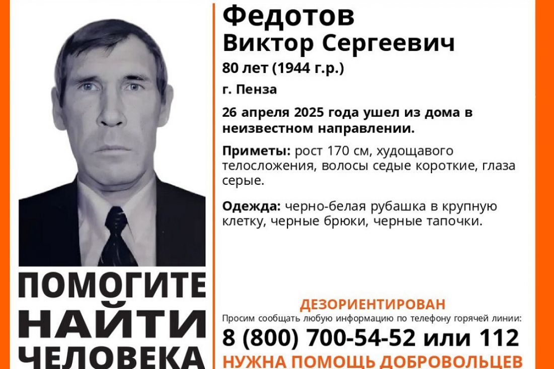 Рост мужчины 170 сантиметров, он худощавого телосложения. Волосы Виктора Федотова седые, короткие, а глаза серые. В день исчезновения он был одет в черно-белую рубашку в крупную клетку, черные брюки и черные тапочки. Мужчина дезориентирован в пространстве.