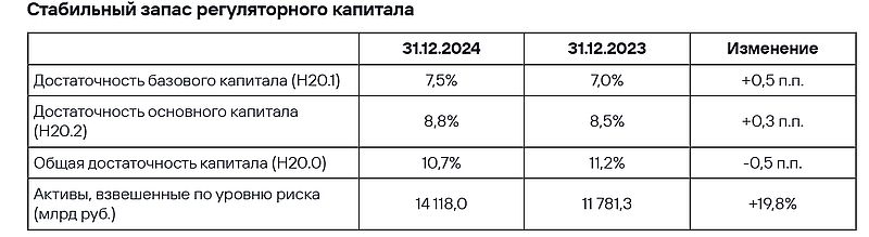 Совокупный капитал Группы, рассчитанный в соответствии с требованиями Базельского соглашения (БазельIII) на основе показателей консолидированной РСБУ-отчетности, составил на 31 декабря 2024 года 1 511,8 млрд руб., рост за отчетный период составил 15,0% (31 декабря 2023 года: 1 314,6 млрд руб.).
