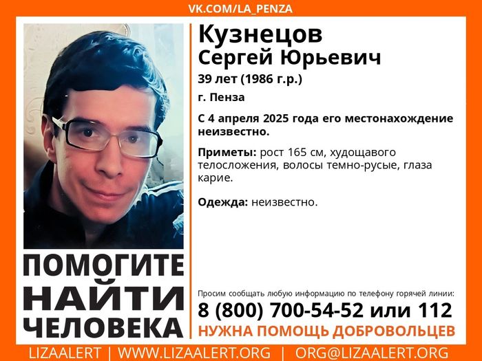 По информации волонтеров, его местонахождение не могут установить с 4 апреля 2025 года. Во что был одет Сергей Кузнецов на момент пропажи, неизвестно.