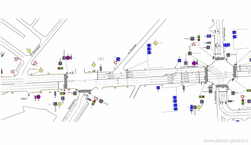 В администрации города Пензы рассказали, что при подъезде к перекрестку со стороны переулка Кузнечного появятся четыре полосы движения. Крайняя правая предназначена для движения направо, две полосы – прямо, крайняя левая – налево. На выезде предусмотрены две полосы.