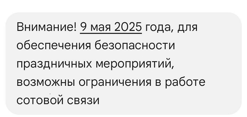 Сегодня около 12:30 пензенцы сообщили в редакцию «Пенза-Взгляд», что получили смс с предупреждением о возможном ограничении связи на 9 Мая.