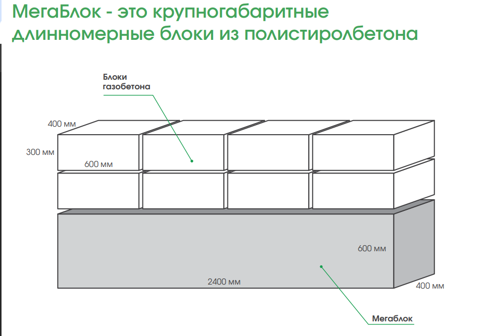 Первое: большой объем. Один МегаБлок равен восьми стандартным газоблокам по размеру. Для будущего покупателя это выгодно тем, что сроки монтажа сокращаются в восемь раз. Также меньше усадка, больше плотность опирания, что позволяет сохранить прочность дома.