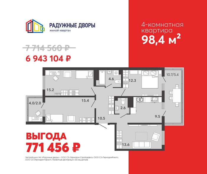 При покупке этой 4-комнатной выгода – 770 тыс. рублей.