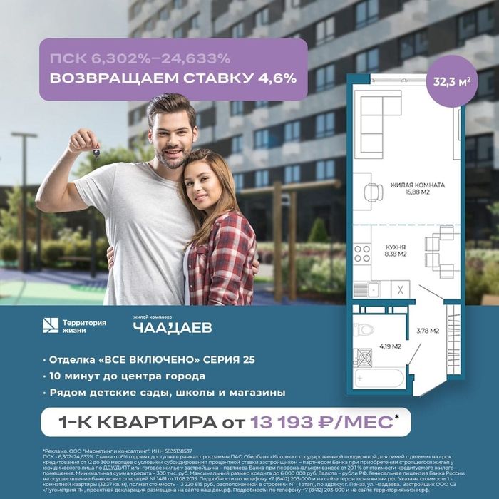 *Ставка от 4,6% годовых доступна в рамках программы ПАО Сбербанк «Ипотека с государственной поддержкой для семей с детьми» на срок кредитования от 12 до 360 месяцев с условием субсидирования процентной ставки застройщиком – партнером Банка при приобретении строящегося жилья у юридического лица по ДДУ/ДУПТ или готовое жилье у застройщика – партнера Банка при первоначальном взносе от 20% от стоимости кредитуемого жилого помещения.Минимальная сумма кредита – 300 тыс. руб. Максимальный размер кредита до 6 000 000 руб. Валюта – рубли РФ. Кредит предоставляется гражданам РФ, имеющим несовершеннолетнего ребенка до 6 лет; установлена категория «ребенок-инвалид»; либо двое или более детей, граждане РФ, один из которых не достиг возраста 6 лет на дату заключения кредитного договора. Необходимо предоставление свидетельств о рождении и подтверждение гражданства всех детей. Генеральная лицензия Банка России на осуществление банковских операций № 1481 от 11.08.2015. ПСК 6,302 - 24,633%. Акция распространяется на на строение №1 ЖК «Чаадаев», расположенного по адресу: РФ, Пензенская область, г. Пенза, ул. Чаадаева. Застройщик ООО СЗ «Лугометрия 11». Проектная декларация размещена на сайте https://наш.дом.рф. Срок действия акции с 20 мая 2025 по 31 мая 2025. Подробности уточняйте у представителей застройщика. Изучите условия кредита! Ознакомьтесь с условиями кредитования.