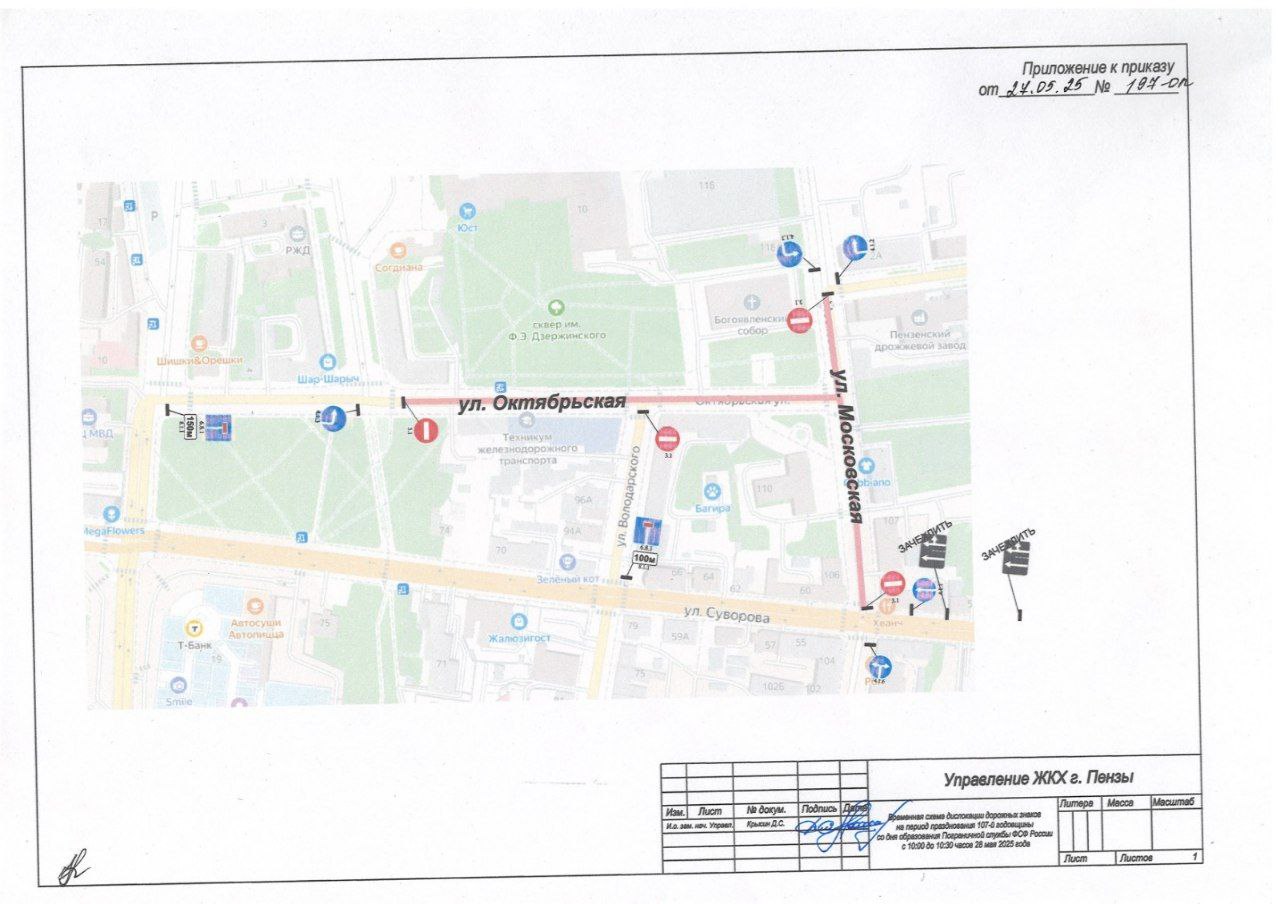 По данным телеграм-канала управления жилищно-коммунального хозяйства Пензы, будет перекрыто движение на следующих участках автомобильных дорог: по улице Московской от улицы Суворова до улицы Долгова, а также по улице Октябрьской от улицы Московской до въезда на Привокзальную площадь «Пенза-1».