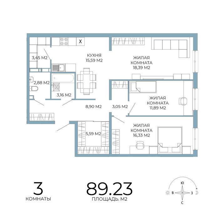 Планировки квартир могут подойти под сценарий жизни, актуальный для клиента. Отличный вариант – трешка в строении №5. Три жилые комнаты, в которых с комфортом разместится семья. Длинный коридор с возможностью обустроить гардеробную. Просторная кухня, где с радостью будет собираться семья. Рядом с ней – небольшая кладовая, где можно хранить заготовки, бытовую технику, уборочные приспособления. А рядом с комнатой запроектирована ниша, которую можно превратить в шкаф-гардероб.