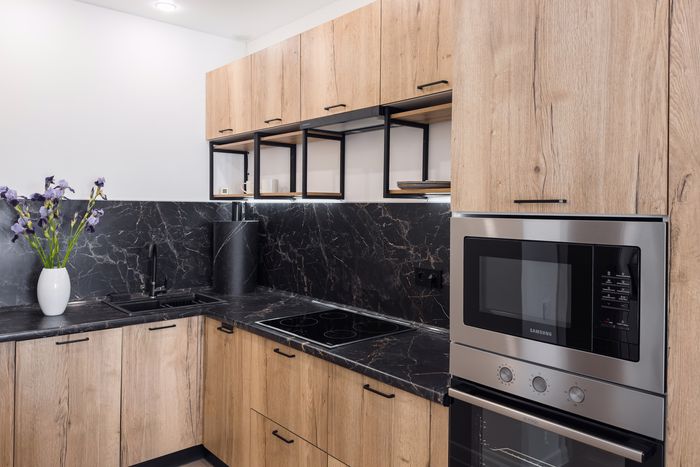 «Территория жизни» полностью обустраивает кухню, в которой уже есть и собран гарнитур. В него встроена бытовая техника - духовой шкаф, вытяжка, варочная панель. Есть стиральная машина. А в квартирах большой площади - посудомоечная машина. Оцените квартиру сами благодаря рум-туру.
