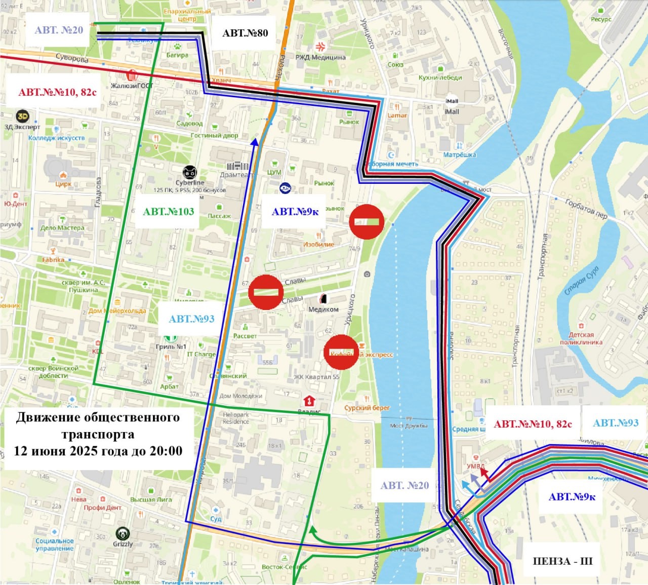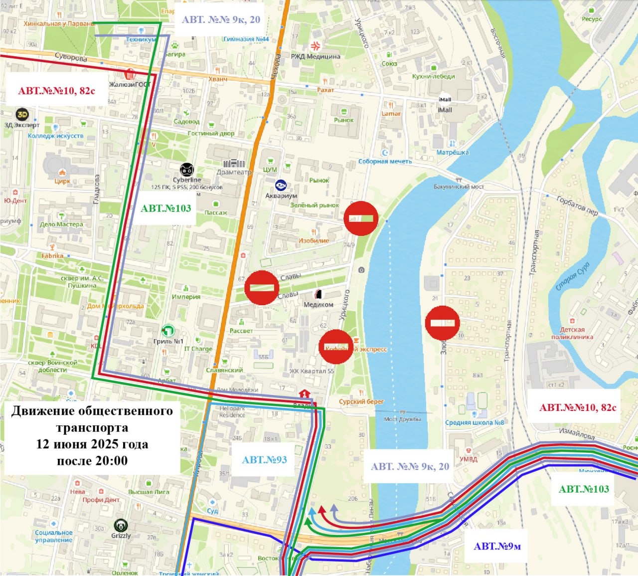 Маршруты №№9К, 10, 20, 82С, 103: с ул. Суворова автобусы поедут по следующим улицам: Володарского - М. Горького - Урицкого - мост им. В.П. Капашина и далее по маршрутам в обоих направлениях;