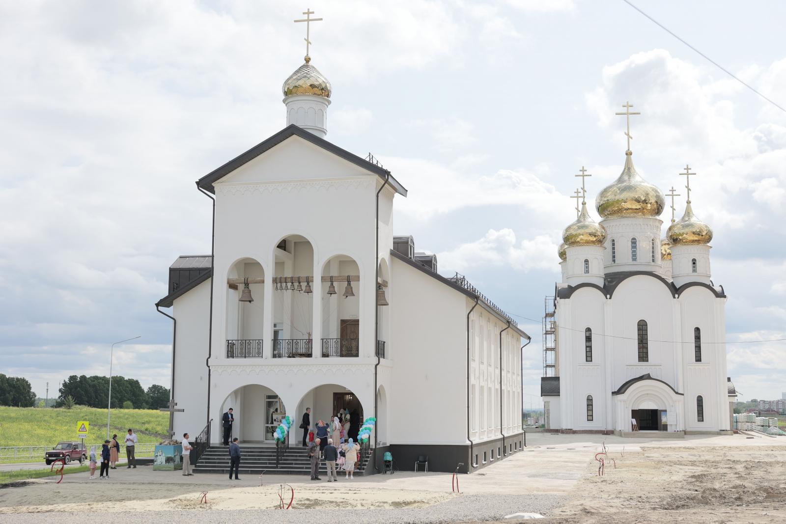 Гости отметили красоту храмового комплекса. Четырехстолповой крестово-купольный храм с пятью куполами, построен в византийском стиле, с элементами, характерными для архитектуры Владимиро-Суздальской Руси. При проектировании «Территория жизни» расположила храм так, чтобы все дороги вели к нему.