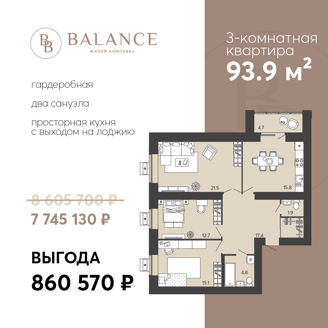 С 16 по 22 июня в акции «Время выгодных решений» участвует квартира в ЖК «Баланс». Это светлая и функциональная 3-комнатная площадью 93,9 кв. м.