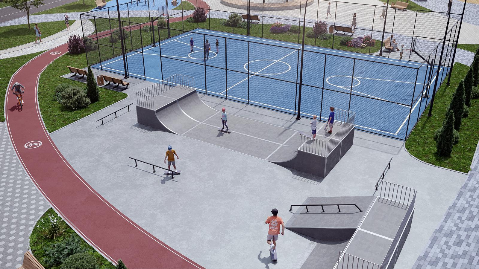- пешеходный бульвар со спортивными площадками, скейт-парком и уютными беседками.