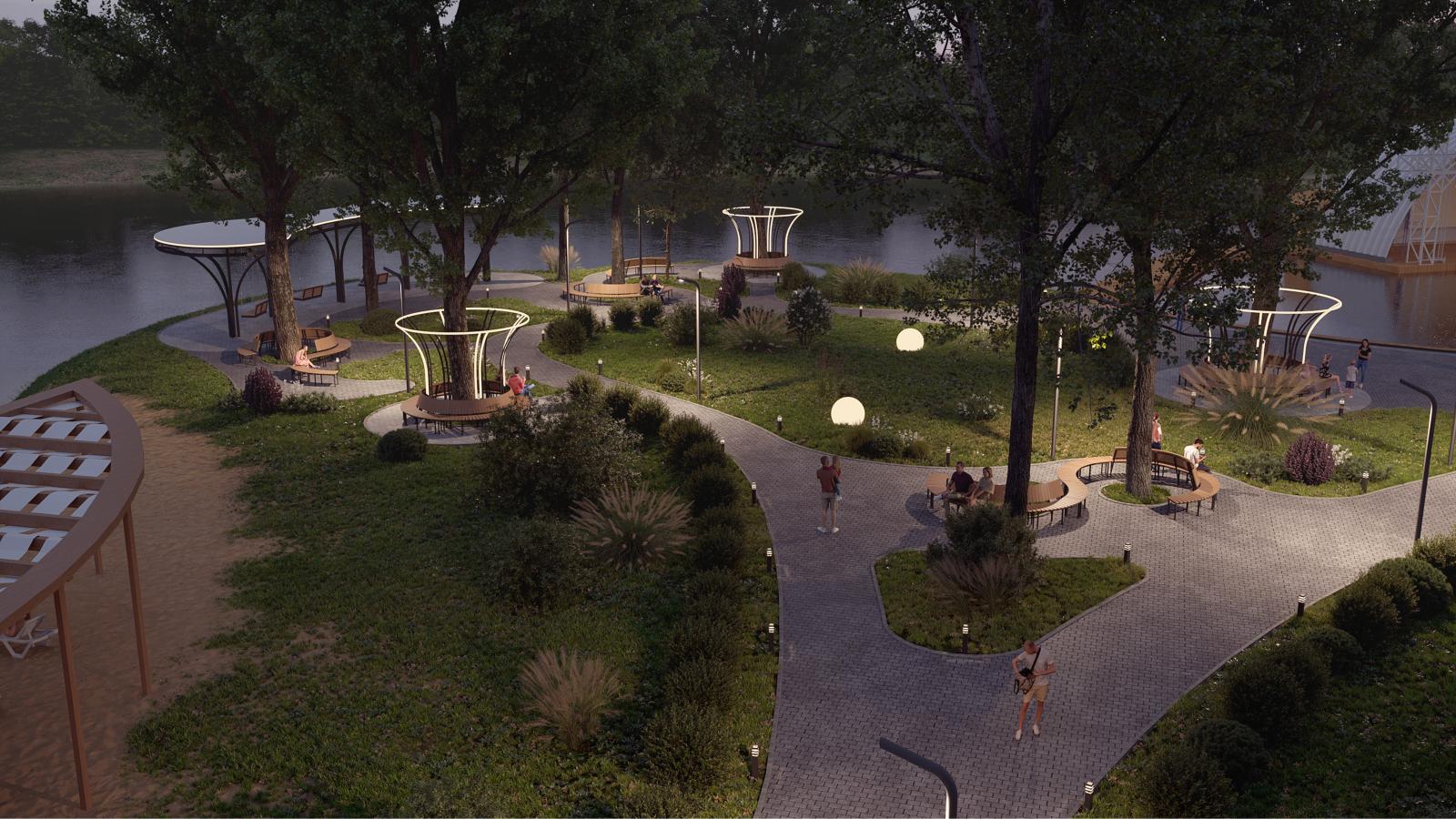 - набережную с пляжем, качелями и кинотеатром на воде;