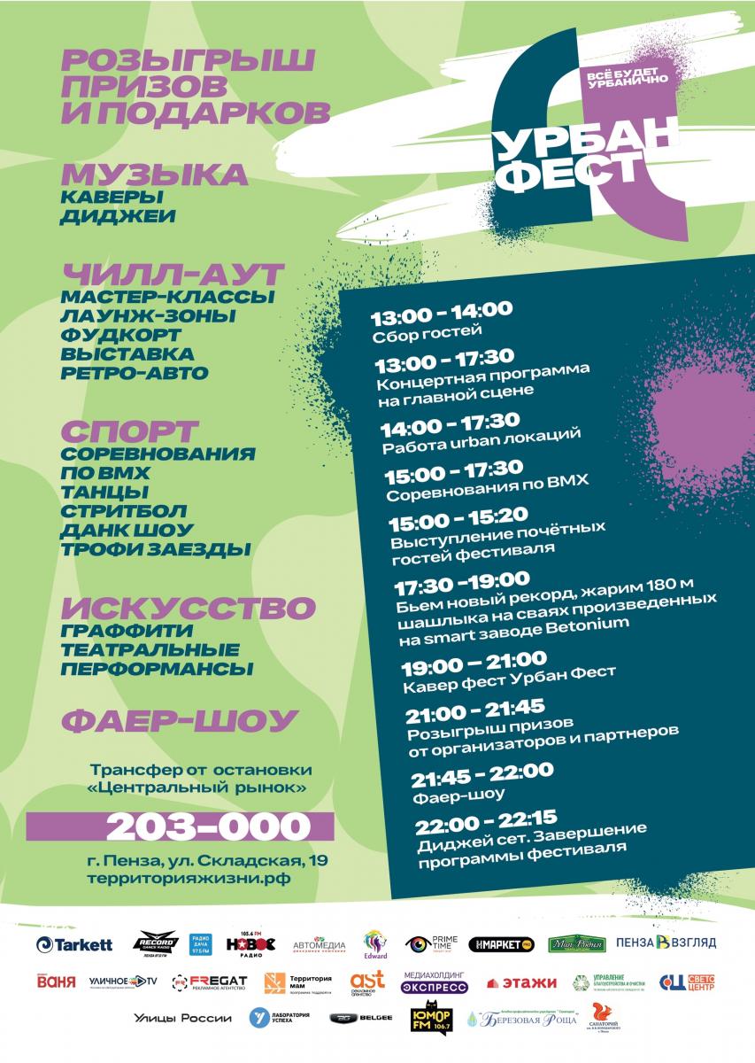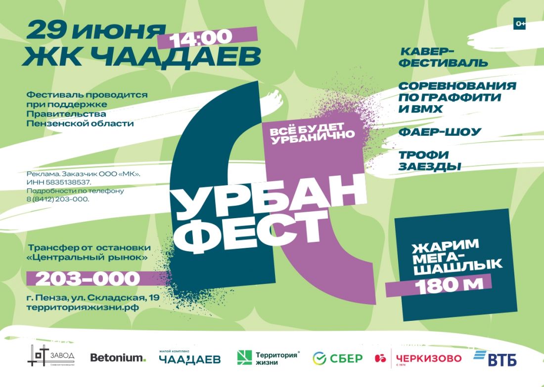 Крупнейший застройщик Пензенской области группа компаний «Территория жизни» приглашает пензенцев на новый яркий фестиваль УРБАН ФЕСТ, который состоится 29 июня на площадке нового строящегося жилого комплекса «Чаадаев».