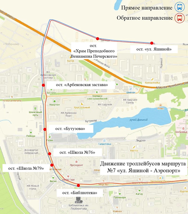 Маршрут №7 «ул. Яшиной — Аэропорт» будет проходить через следующие остановки: