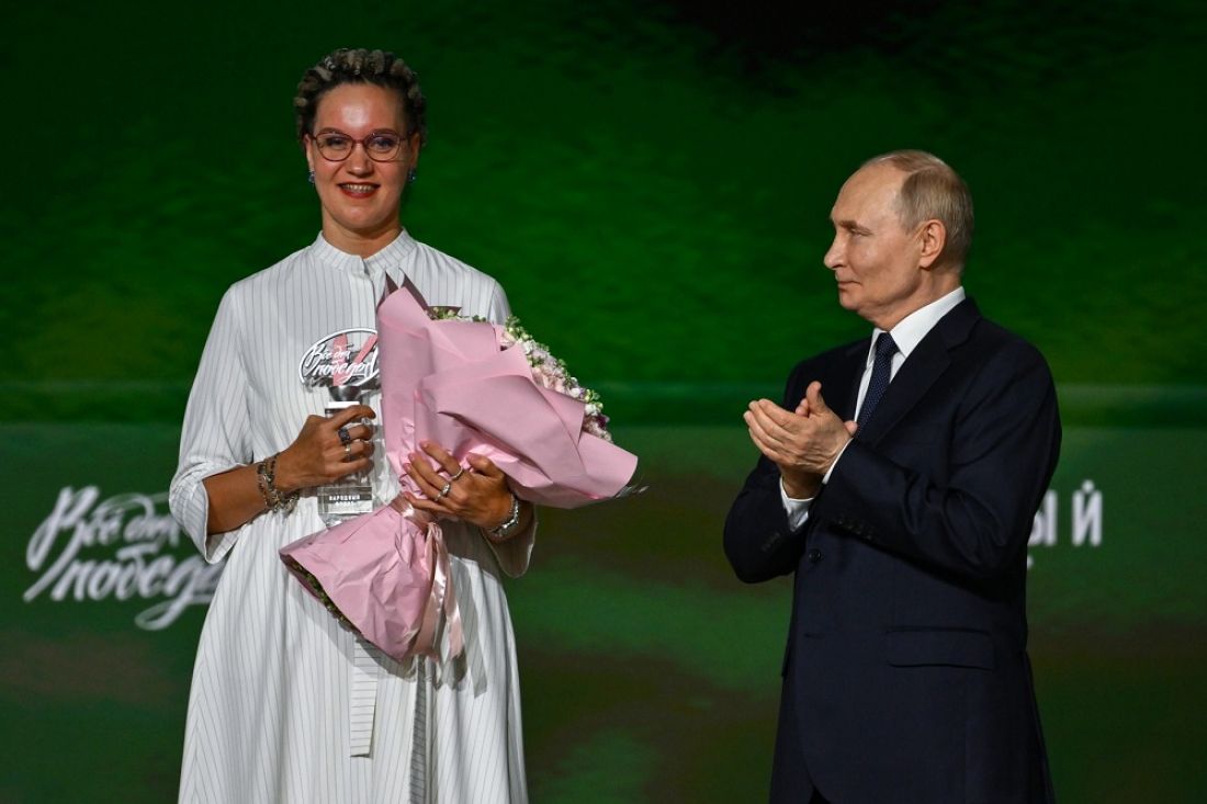 Президент вручил премию Ольге Язевой за ее работу по пошиву одежды для бойцов. Ольга — жена священника, ее сыновья участвуют в СВО. Она покупает ткани на пожертвования прихожан, а шить одежду помогают около 100 женщин-волонтеров.