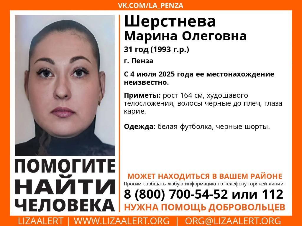 Как сообщили представители поискового отряда «Лиза Алерт Пенза» на официальной странице в социальной сети «Вконтакте», Марина Шерстнева 1993 года рождения пропала 4 июля. Как сообщили в пресс-службе СУ СК России по Пензенской области, последний раз она была замечена в промежутке с 15 до 17 часов около дома № 54«а» по улице Ульяновской в Пензе, откуда направилась в неизвестном направлении.