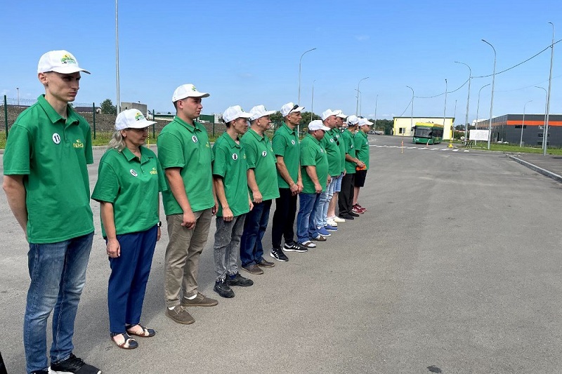 На открытой площадке проходит конкурс водителей троллейбусов. В нем участвуют 11 профессионалов. Они соревнуются в умении управлять транспортным средством и общаться с пассажирами.