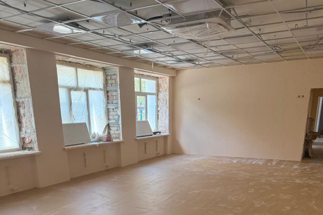 Продолжаются работы по ремонту фасада, цоколя, полов. Подрядная организация ведет отделку и электромонтажные работы, ремонтирует системы водоснабжения, водоотведения, вентиляции и отопления, меняет двери и ремонтирует отмостку.