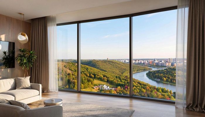 Промт для идеальной картинки «квартиры будущего» от Kandinsky: Вид из панорамного окна современной квартиры в Пензе, Россия. Летний день. На переднем плане – зеленые холмы, покрытые смешанным лесом (лиственные и хвойные деревья). В долине между холмами видна извилистая река (Сура или приток). На заднем плане – утопающие в зелени кварталы города. Яркая зелень, солнечно. Стиль: Реализм, умиротворяюще, атмосферно, продающее. Внутри квартиры – теплый дневной свет.