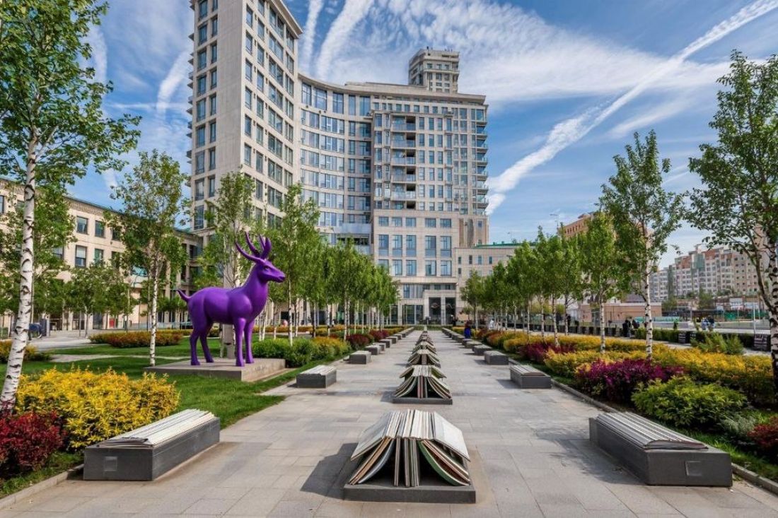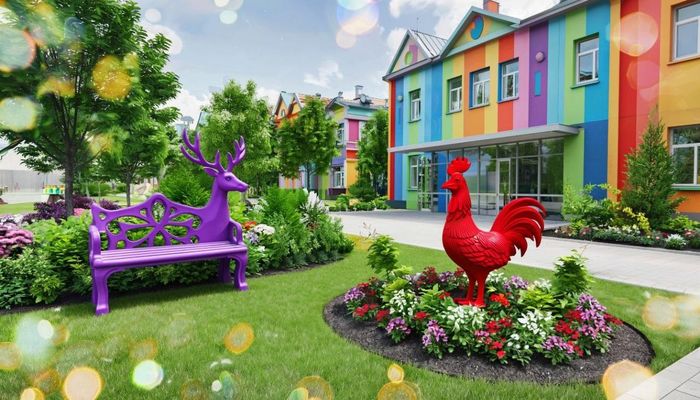 Промт для Kandinsky: Идеальный двор без машин в Пензе, Россия. Парковая зона с липами и березами, детская площадка с яркими скульптурами животных (абашевская игрушка) и горкой в форме дудочки, аллея со скамейками-книгами, спортивная площадка среди деревьев, зона мастерской со столами, зона отдыха с гамаками. Стиль: Яркий эко-фолк.