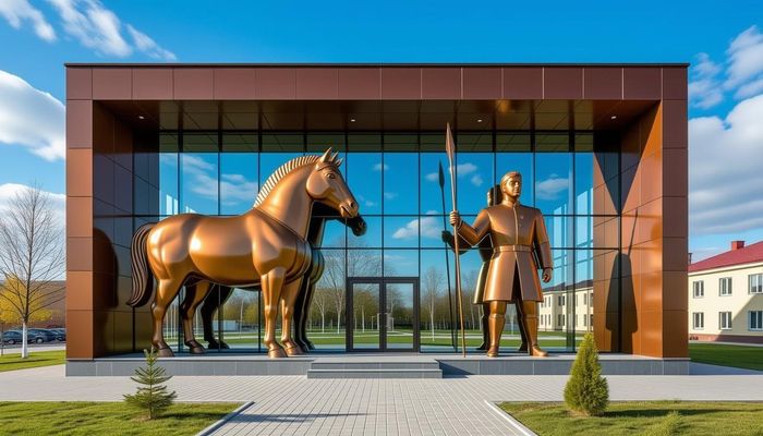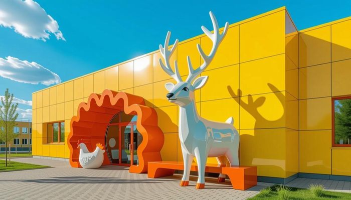 Промт для Kandinsky: Пешеходная зона в центре Пензы, Россия. Сохраненные старые дома (классические, деревянные). В глубине двора – новый современный корпус (3 этажа) с классическими пропорциями, но с яркими керамическими вставками на фасаде в форме абашевских петушков/оленей. Во дворе – инсталляция из крупных стилизованных игрушек, скамейка с цитатой. Стиль: Яркий реализм, фолк-модерн.