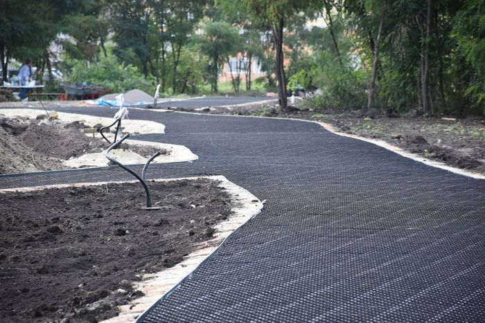Денисов рассказал, что на пешеходных дорожках сквера уложена георешетка, которая фиксирует выбранный наполнитель — гранитный отсев. По словам градоначальника, этот материал наиболее экологичен.