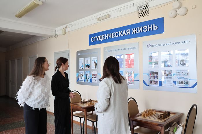 Теперь фойе встречает студентов, преподавателей и гостей преображённым современным обликом. Здесь установлены стилизованные стенды с актуальной информацией, обновлена главная вывеска-логотип и заменены все таблички. Для комфортной молодежной комнаты переговоров приобретены новые кресла-мешки.