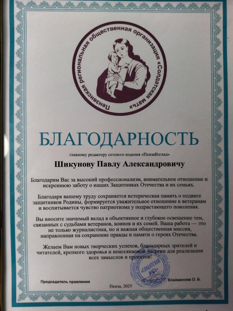 Кроме того, отдельную благодарность от председателя правления пензенской региональной общественной организации «Солдатская мать» Ольги Клейменовой получил директор-главный редактор сетевого издания «Пенза-Взгляд» Павел Шикунов. Его поблагодарили за высокий профессионализм, внимательное отношение и искреннюю заботу о Защитниках Отечества и их семьях.