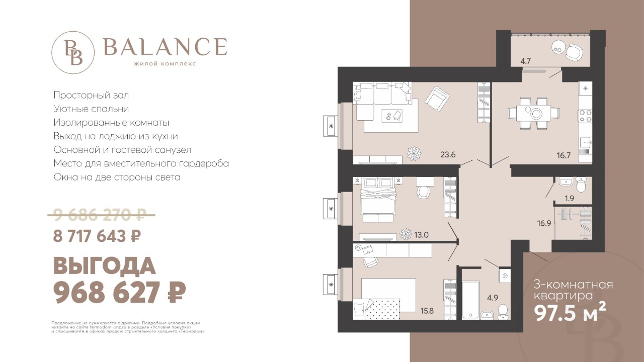 Только на неделе с 15 по 21 сентября получить ключи от 3-комнатной квартиры в жилом комплексе «Баланс» в Пензе можно с выгодой в 968 627 рублей!