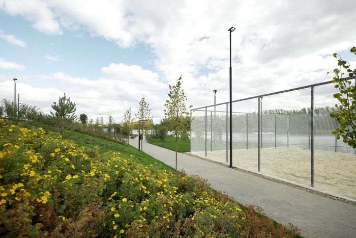 Протяжённость набережной свыше 600 метров. Прогулочные зоны расположены в несколько уровней благодаря рельефу, дополнены многоуровневым озеленением и арт-объектами. На берегу пруда на площади в 2,5 га разместились спортивные площадки – для баскетбола и пляжного волейбола, детские игровые зоны, места для отдыха и созерцания с качелями и видом на водную гладь.