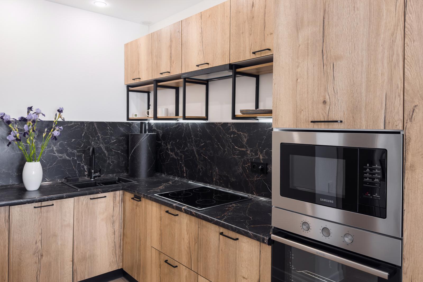 Если вы выбираете отделку «Все включено», то в комплекте идет готовый кухонный гарнитур со встроенной вытяжкой, варочный плитой, духовым шкафом – все это ждет вас в новой квартире. А если она большой площади – в гарнитур встроена посудомоечная машина.