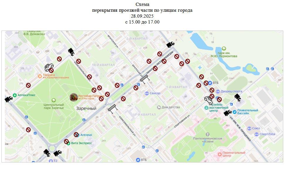 Как пояснили в управлении общественных связей Заречного, для подготовки к проведению спортивно-массового мероприятия «Забег «Заречный» с 9:00 до 19:00 28 сентября перекроют движение для транспортных средств на участке автомобильной дороги от обелиска Победы до арки дома №22 на проспекте 30-летия Победы.
